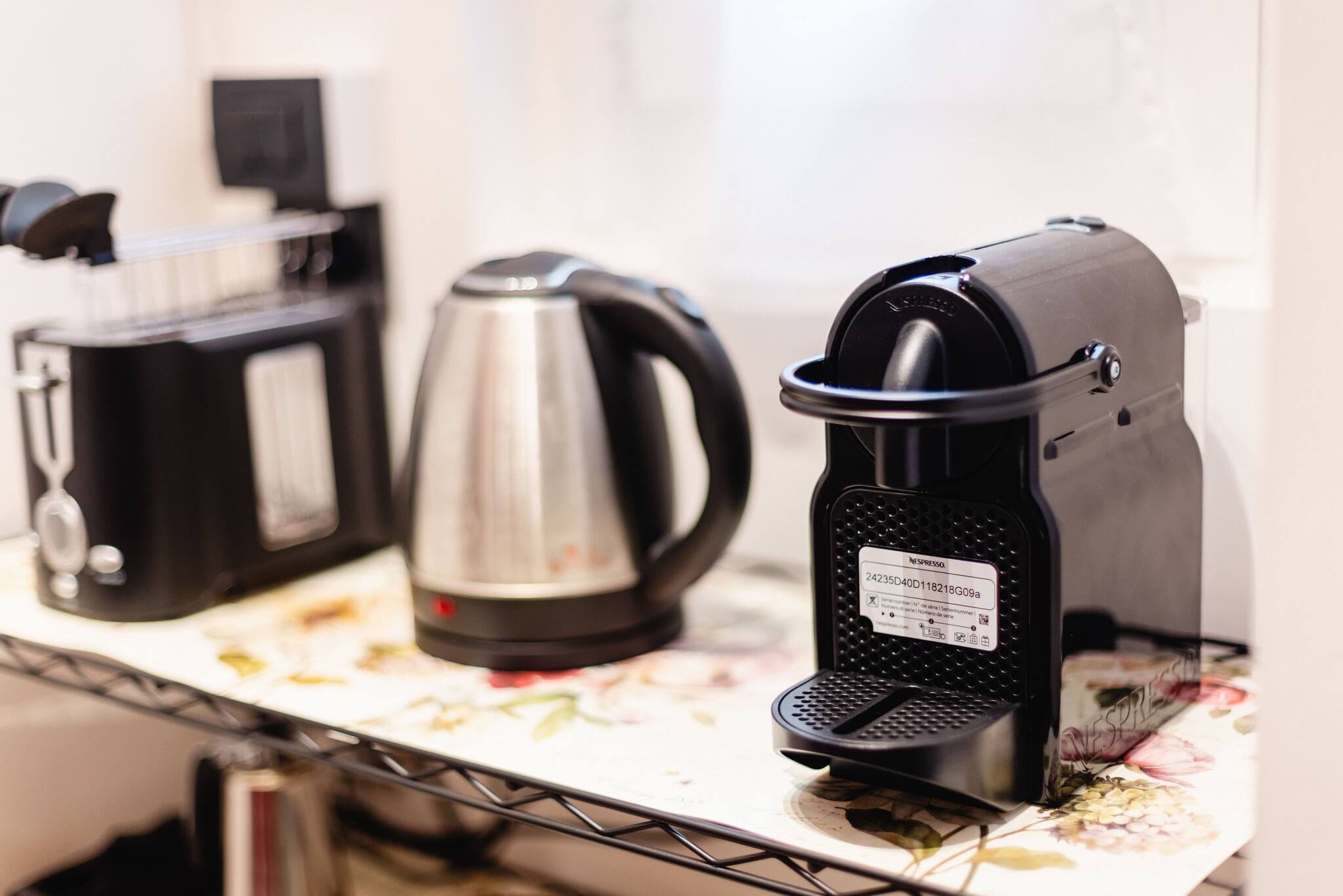 La zona living offre un divano letto matrimoniale e una cucina attrezzata con frigorifero, microonde, macchina da caffè, tostapane e bollitore.