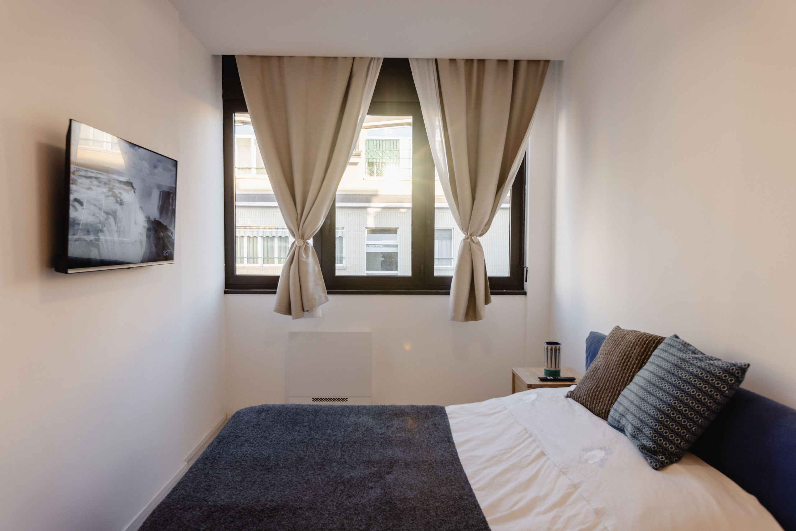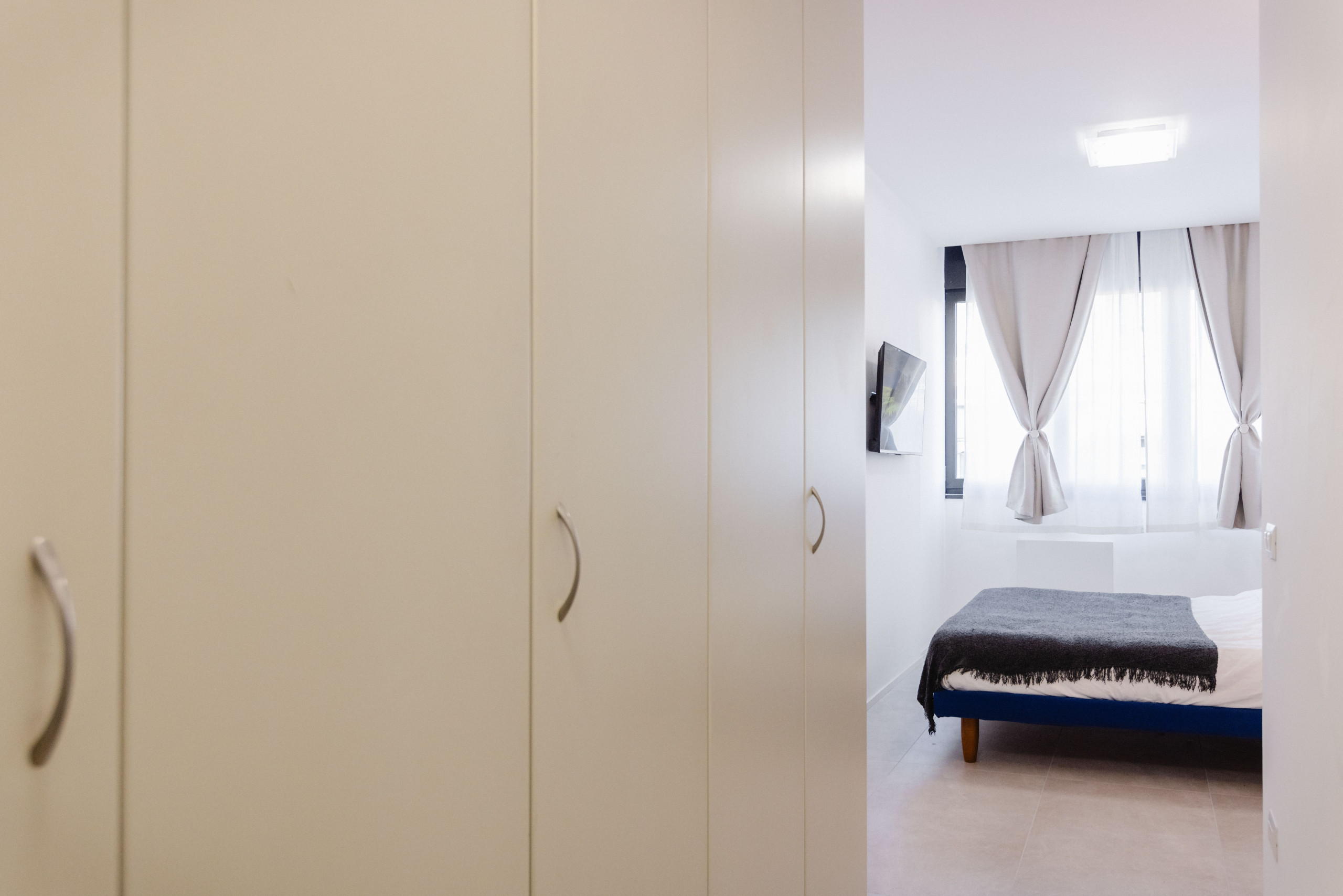 Camera da letto con lenzuola, cuscini, coperte extra, grucce negli armadi, tv in camera