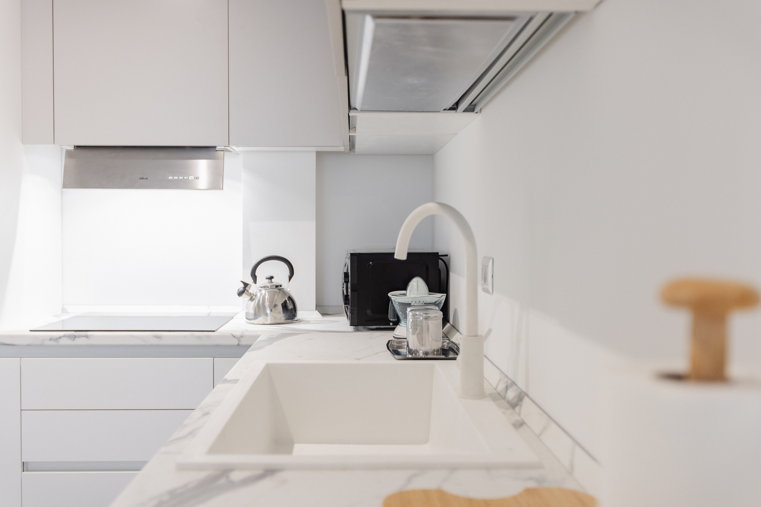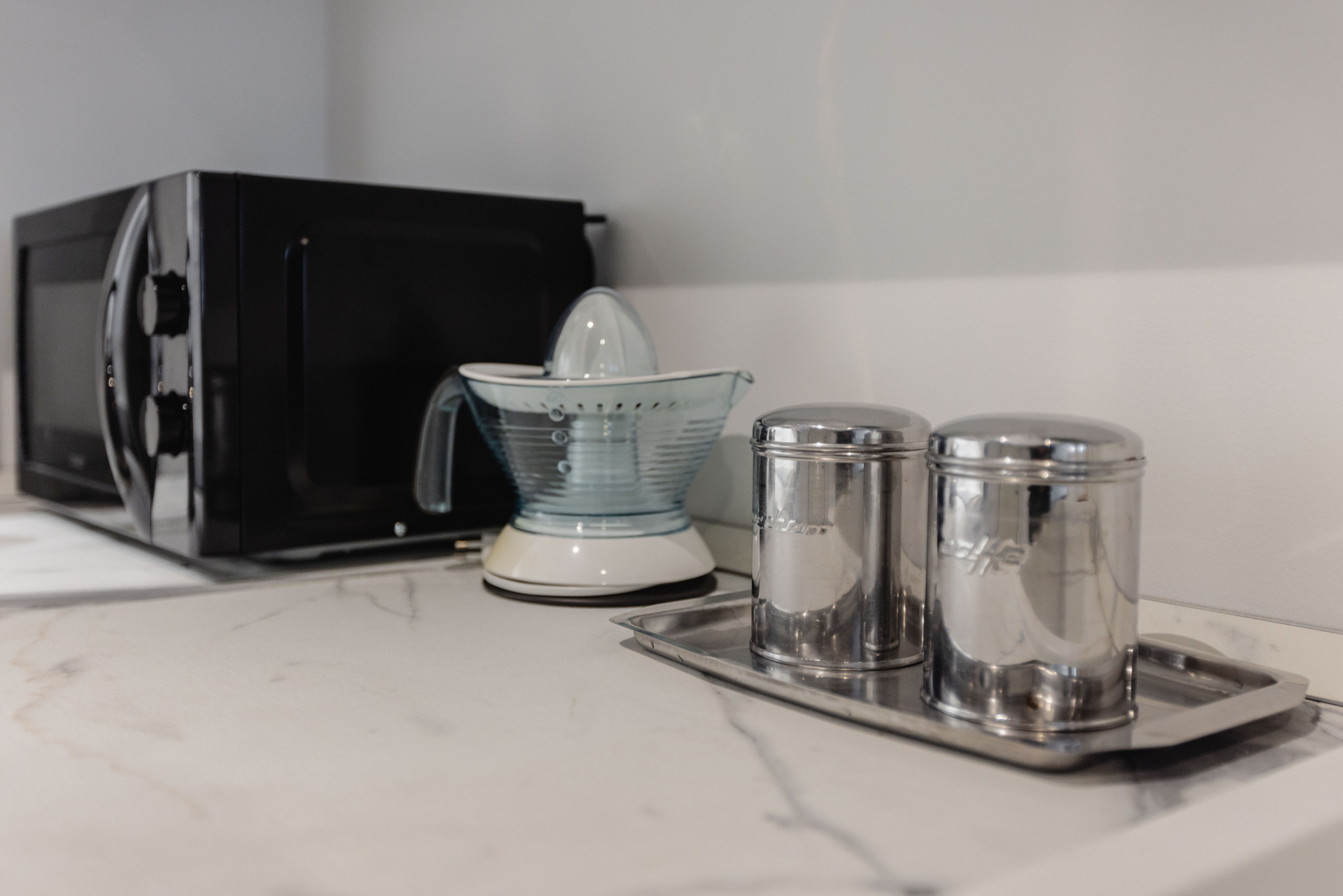 cucina fornita di forno a microonde, friggitrice ad aria, forno, utensili.