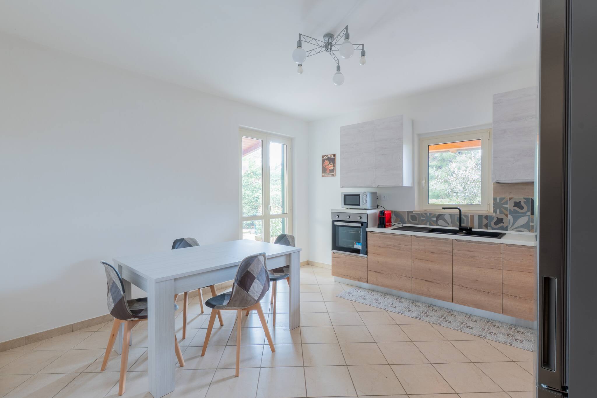 Cucina completamente attrezzata con frigorifero, forno, microonde, caffettiera, stoviglie e utensili