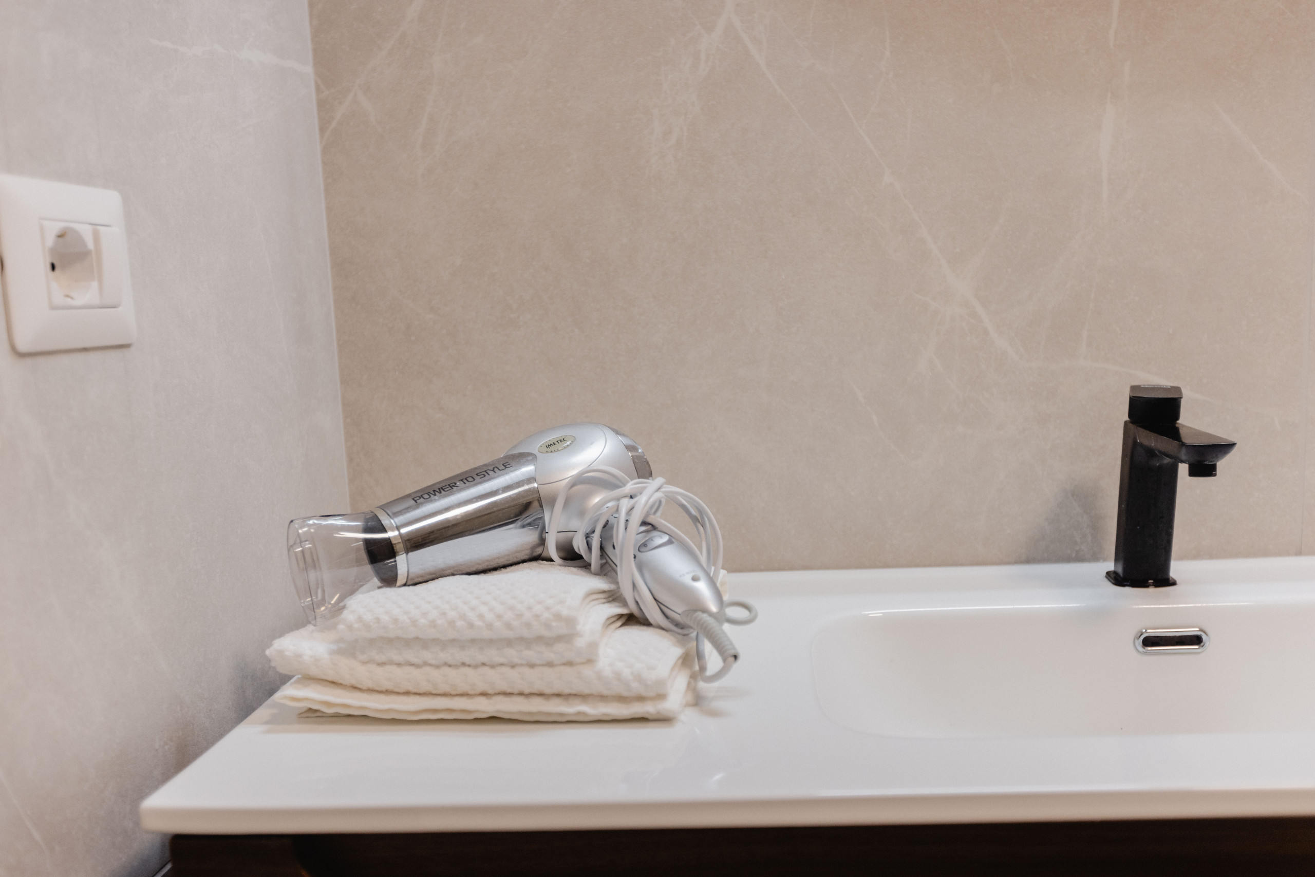 Bathroom provided with linen, shower gel and shampoo, hairdryer