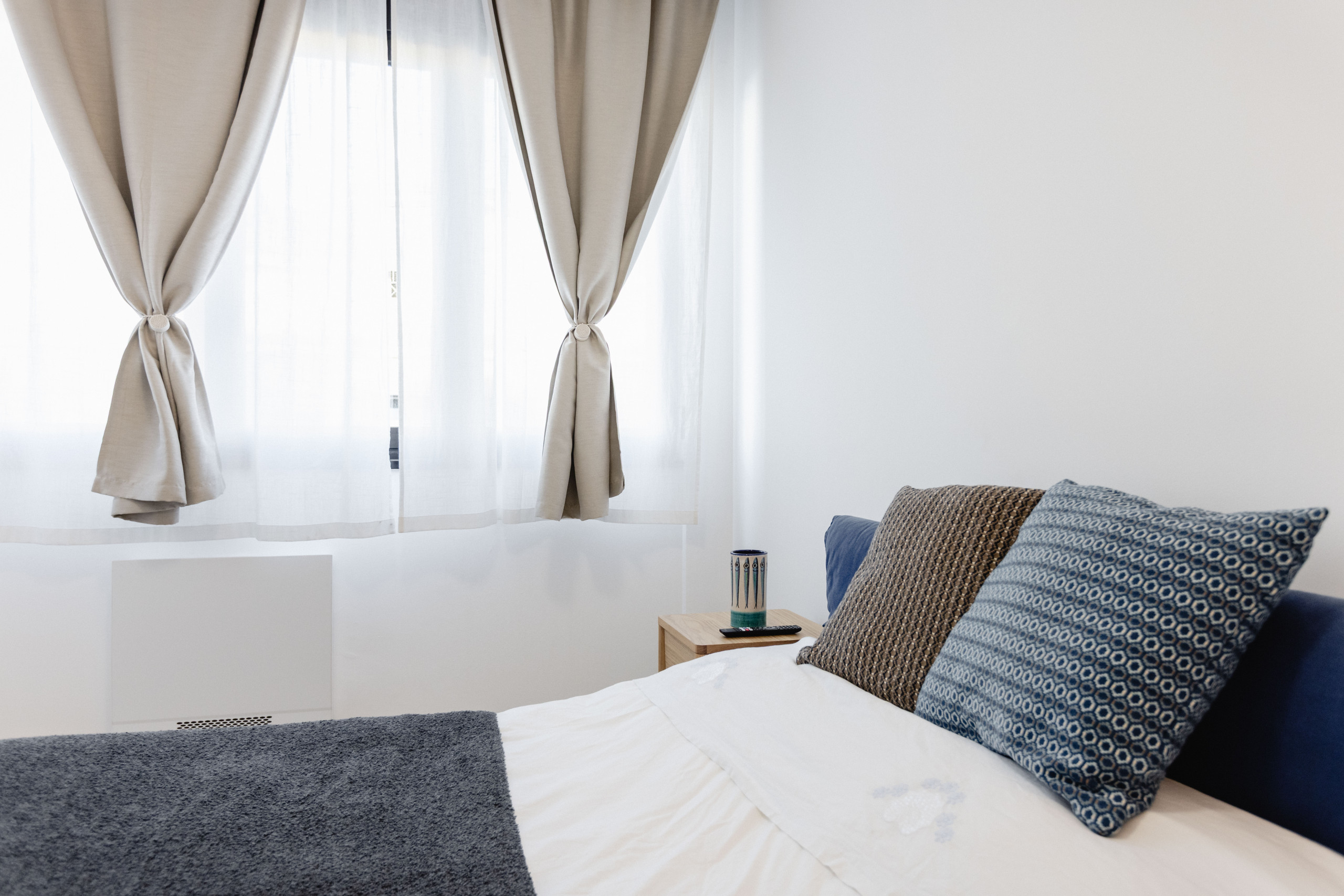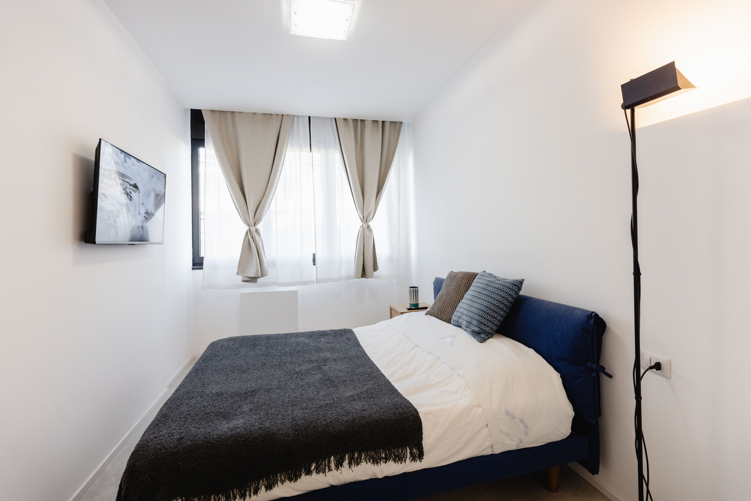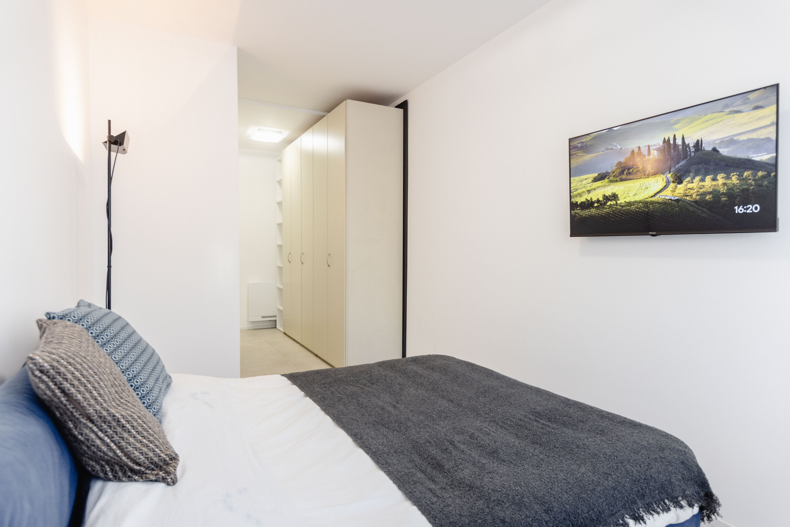 Bedroom with sheets, pillows, extra blankets, hangers in wardrobes, TV in room